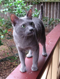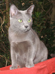 Our association with Korats started in 1992. While looking for an outgoing breed of cat we saw an advertisement for Korat kittens. At the time our only knowledge about the breed was gleaned from information in cat books. Not long after, we met the little ball of steel wool and it was love at first sight. A delightful and playful boy, Ziggy's antics never failed to amaze us. He had a true Korat temperament - mild, with a will of iron! Ziggy was not afraid of anything and was convinced that he could do anything he had not previously been told not to, adapted quite easily to new situations, and had good self confidence. Playful, loyal and affectionate, Ziggy and our toy poodle, Monty, became inseperable. His premature death left a huge hole in our lives and a determination to learn more about this rare and little know breed.