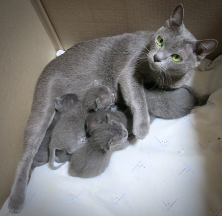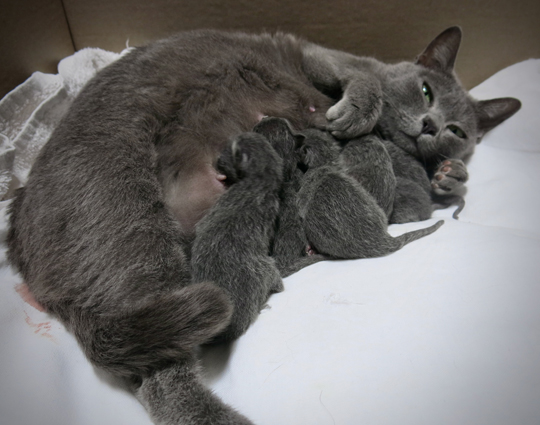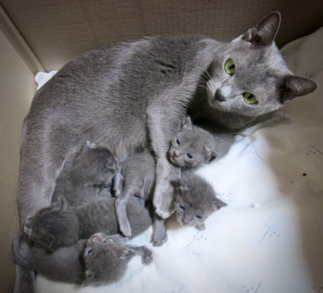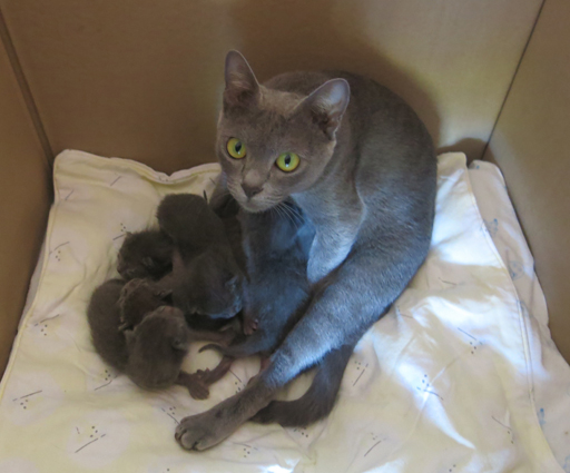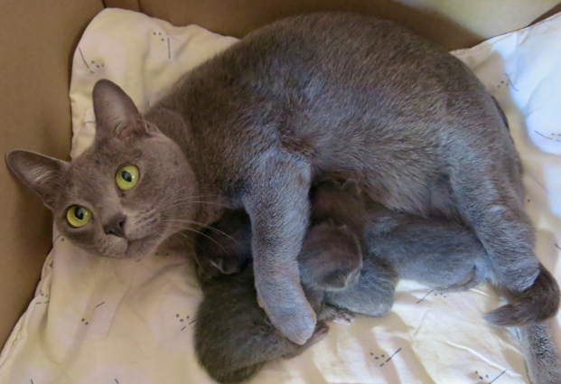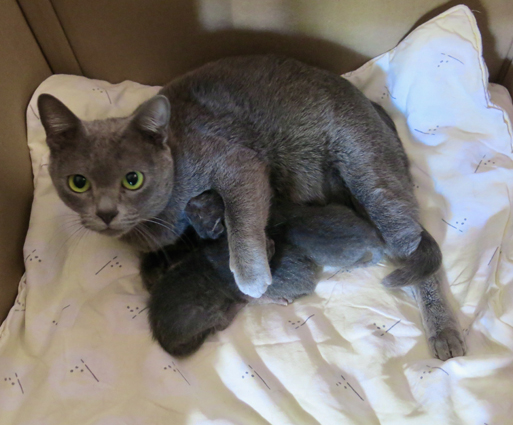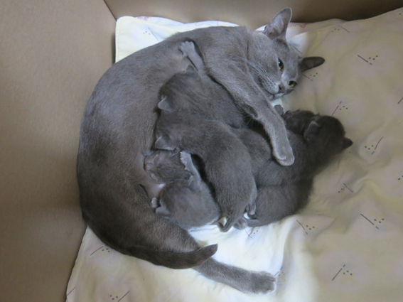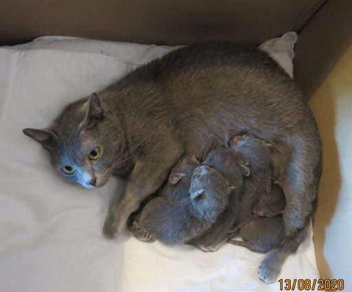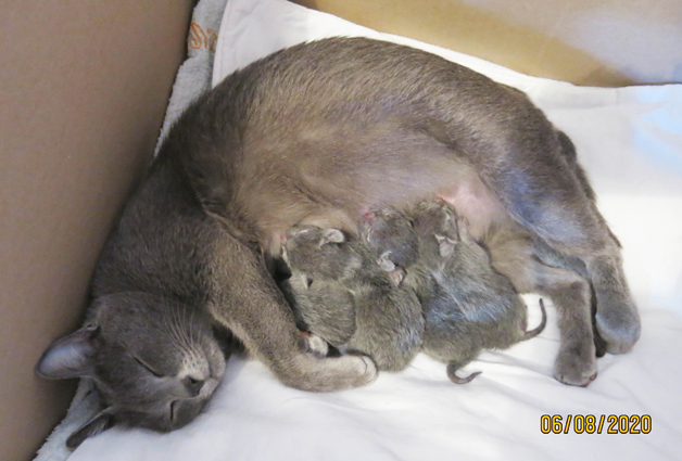 Dixie with her week old kittens, is adapting well to being a new mum.