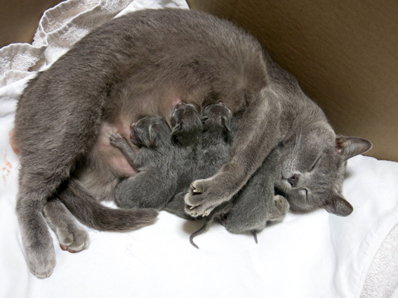 Dixie and her 1 week old kittens, sweet little things