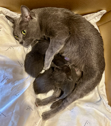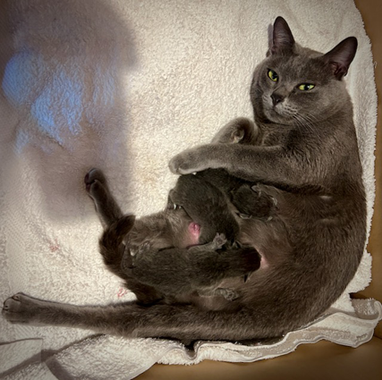 Dixie welcoming and settling her 3 new kittens